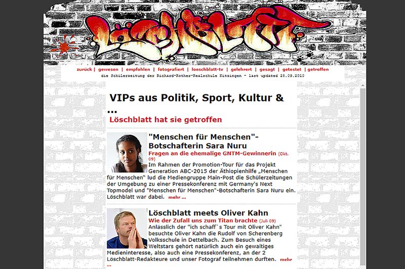 Im Sommer 2010 war dann Schluss, die Konkurrenz von facebook und Co ließen das Interesse der Schüler an loeschblatt.com sinken, ebenso die Motivation der Redaktion und das Projekt wurde so mit etwas Frust beendet. Aber die komplette Webseite ist bis heute mit allen Artikeln im Netz abrufbar. Hier geht`s zu www.loeschblatt.com ...