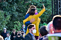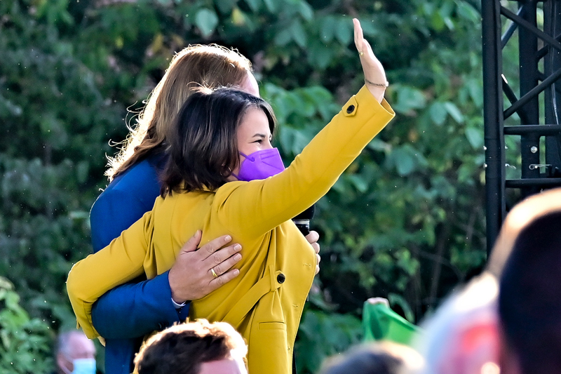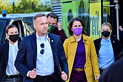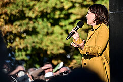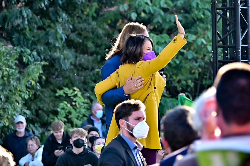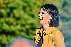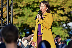 Im Lauf der Veranstaltung treffe ich zufällig auch Frau Anselm und ihren Mann Herrn Ulherr, der seinen Fotoapparat dabei hat. Gemeinsam versuchen wir am Ende der Wahlveranstaltung in die Nähe von Frau Baerbock zu gelangen. Leider gelingt es uns „nur“ zwei Meter an sie heranzukommen - schade, aber nicht verwunderlich, sind doch Politiker aufgrund der aktuell aufgeladenen Stimmung immer potentiellen Gefahren ausgeliefert.
