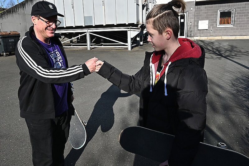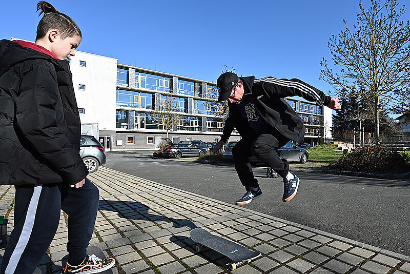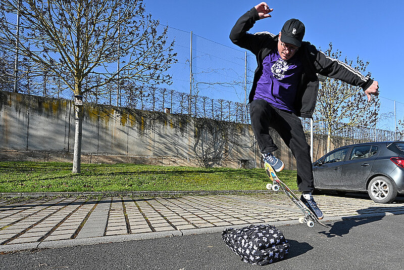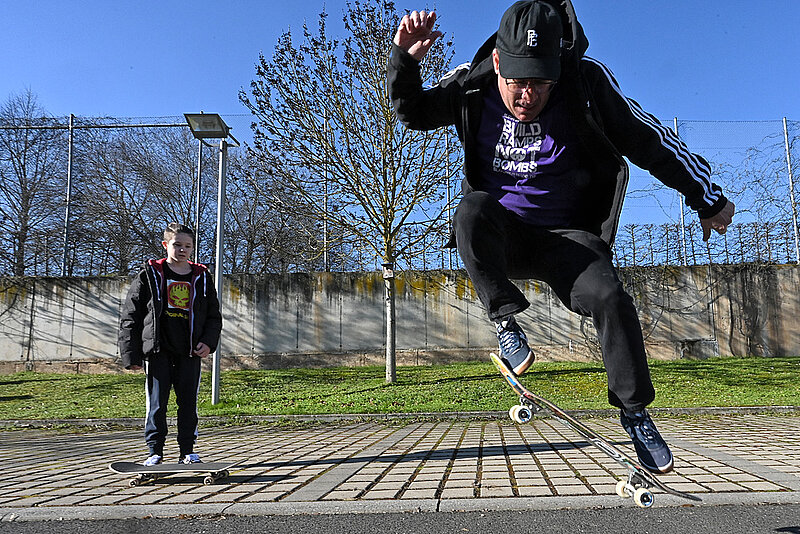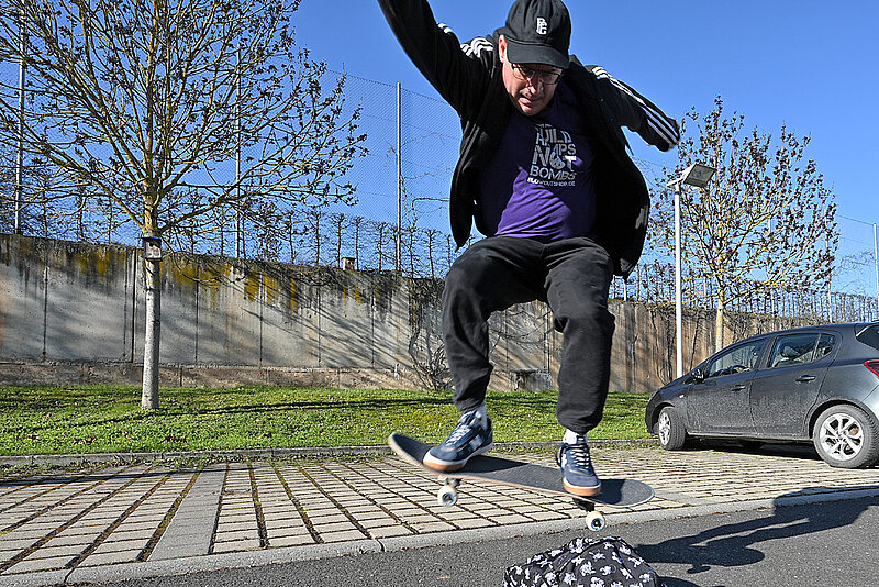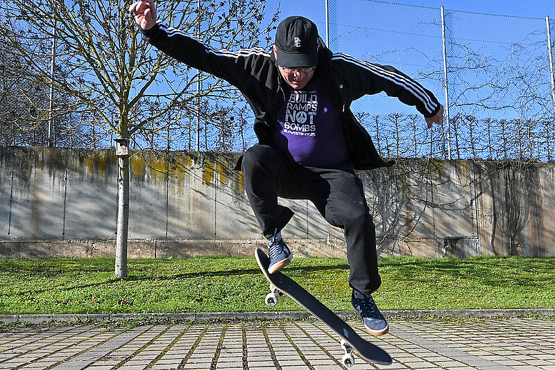 Herr Hellmuth: Ich hatte mit zwölf Jahren ein billiges Kaufhausboard mit Plastikrollen, mit dem ich geübt habe, so schnell wie möglich eine steile Straße hinunterzufahren. Ab einer bestimmten Geschwindigkeit hat das Board immer angefangen zu schlackern und ich habe mich einige Male überschlagen. Ich bin aber immer wieder aufgestanden und habe es gleich wieder probiert. Mit dreizehn habe ich dann mein erstes "richtiges" Skateboard bekommen und dann ging es gleich besser mit dem Downhillfahren. Meinen ersten Olli habe ich dann nach einem halben Jahr gestanden. In den Achtzigern gab es keine Internet-Tutorials und in Lohr auch keine anderen Skater, die einem Tricks zeigen konnten. Ich musste mit dem Zug nach Aschaffenburg oder Würzburg fahren, um andere Skater zu treffen.