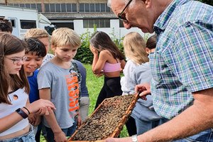 Alle 6ten Klassen konnten Ende Juli die Bienenwesen eines Bienenvolks und das Imkern hautnah erleben.