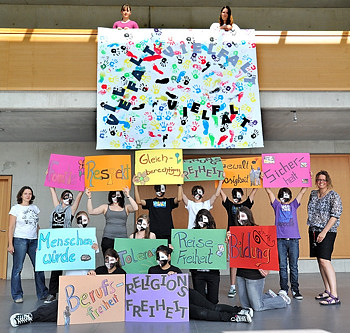 Gleichzeitig stürmten die 12 Aktivisten mit eigen entworfenen Plakaten in die Aula und sprangen begleitet von Tarantinos „Pulp Fiction“ wild umher. Die SchülerInnen der Aula beobachteten verwundert und zunächst verständnislos das wilde Treiben. Mit dem plötzlichen Verstummen der Musik erstarrten die Aktivisten und froren ihre momentane Haltung für eine Minute ein, ihr Plakat mit den Menschenrechten den SchülerInnen zeigend. Durch dieses Einfrieren machten die Aktivisten auf Werte der westlichen Welt, persönliche Grundrechte und Menschenrechte wie z. B. Meinungsfreiheit, Gleichberechtigung, Religionsfreiheit, Toleranz, Gewaltlosigkeit, Familie oder Recht auf Bildung und Arbeit aufmerksam. Diese oben genannten Rechte sind für uns hier selbstverständlich, für manch andere Nationen der Welt wie z. B. Afghanistan oder dem Irak nicht. Nach dem erneuten Einsetzen der Musik verließen die Aktivisten ihre „Freeze“–Haltung und verschwanden so schnell, wie sie aufgetaucht waren.