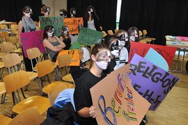 12 mutige SchülerInnen waren bereit, diese Aktion durchzuführen. Wir hatten im Vorfeld ein großes Plakat mit unseren Finger- und Fußabdrücken in verschiedenen Farben vorbereitet. Dieses Plakat sollte die „bunte“ Vielfalt der Menschen symbolisieren, die an unserer Schule gemeinsam lernen, lehren und zusammen arbeiten. Zwei Aktivistinnen entrollten dieses Plakat über den Köpfen der SchülerInnen in der Pausenhalle.
