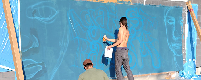 Am vergangenen Wochenende entstand das Graffiti , das ihr seit heute in der Aula hängen seht. Es zeigt ein indisches Hindu-Mädchen und ein Mädchen mit europäischen Gesichtszügen. Gemeinsam auf dem Bild vereint, symbolisieren sie das friedliche Nebeneinander von Menschen aus unterschiedlichen Kulturkreisen. Der Schriftzug "Against Racism" besteht aus Buchstaben unterschiedlichster Formgebung. Diese Verschiedenheit und die individuelle Schönheit der einzelnen Buchstaben sollen ebenfalls die Individualität und den Wert jedes einzelnen Menschen unterstreichen.