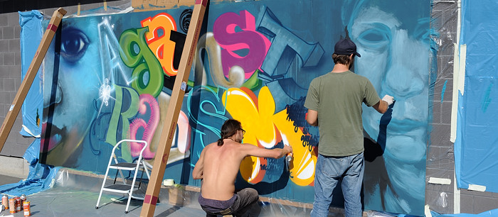 Wir haben`s geschafft: ab diesem Schuljahr ist unsere Schule eine "Schule ohne Rassismus - Schule mit Courage". Weit über 90% unserer SchülerInnnen und Schüler, LehrerInnen und Lehrer haben sich bewusst gegen jede Form von Diskriminierung, Mobbing und Gewalt ausgesprochen. Um uns diese Einstellung immer wieder ins Gedächtnis zu rufen, haben Frau Anselm und Herr Ulherr zwei professionelle Sprayer beauftragt, das Projekt gegen Rassismus künstlerisch umzusetzen.