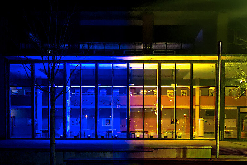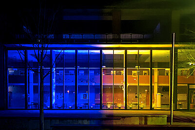 Die SMV der Realschule Kitzingen hat in Zusammenarbeit mit dem Wahlfach Veranstaltungstechnik die Aula in blau - gelb, den Farben der ukrainischen Flagge, beleuchtet.