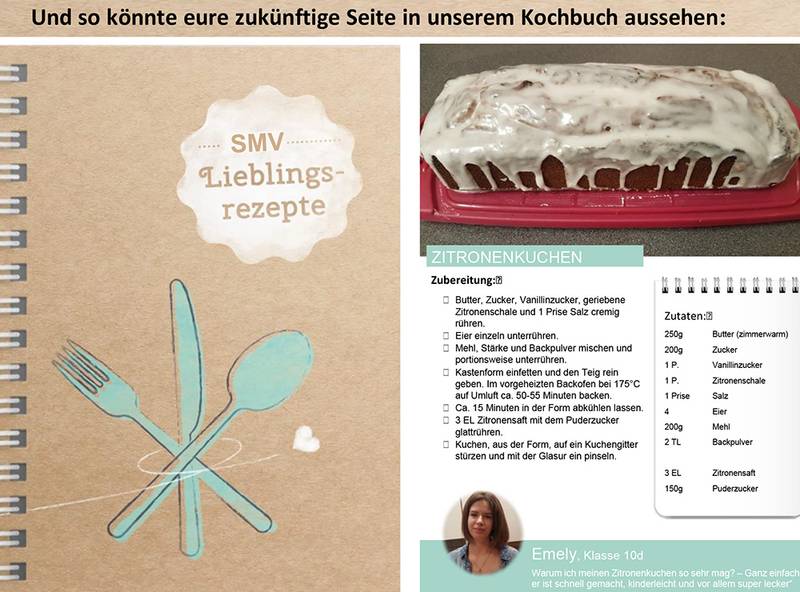 Unsere Idee ist es ein KOCHBUCH zu erstellen und die gesammelten Rezepte auf unserer Homepage zu präsentieren bzw. ausgewählte Rezepte im nächsten Hausaufgabenheft abzudrucken.