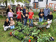 Herr Pasurka als betreuende Lehrkraft des Schulgartens und die fleißigen, kleinen Gärtner freuten sich, als Elternbeiratsvorsitzende Kerstin Wirsing vorbeikam und die Pflanzen vorbeibrachte. Nun hoffen wir alle, dass durch gute Pflege der Wahlfach-Mitglieder die Ernte gut ausfällt und die Kids dann in der Schulküche das Gemüse lecker zubereiten können.