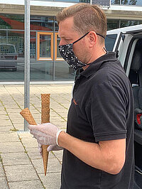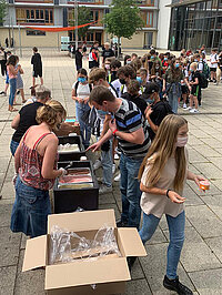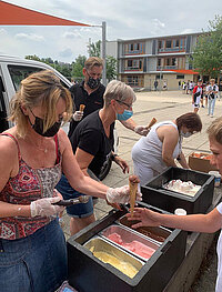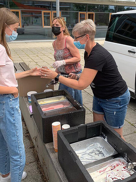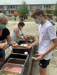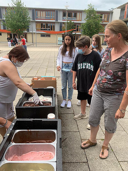 Am 27.07.2021 hat der EB eine „Überraschungsmoment-Eis-Aktion“ für alle Schüler und Lehrer gemacht. Die Eisdiele *CremAMarena* aus Marktbreit spendete uns 8 Behälter mit frischem, leckeren Eis :) Nach einer kurzen Ansprache über das Seki-Mikrofon, in der 1. Vorsitzende Kerstin Wirsing allen Schülern, Lehrern, den Damen vom Sekretariat und auch der Schulleitung ein großes Dankeschön für diese tolle Leistung und den Zusammenhalt während des gesamten vergangenen Corona-Schuljahres aussprach, durften alle Schülerinnen und Schüler aller Klassen in den Pausenhof kommen und sich aus den Sorten Schoko, Vanille, Erdbeere, Zitrone und Stracciatella ihr Lieblingseis auswählen.